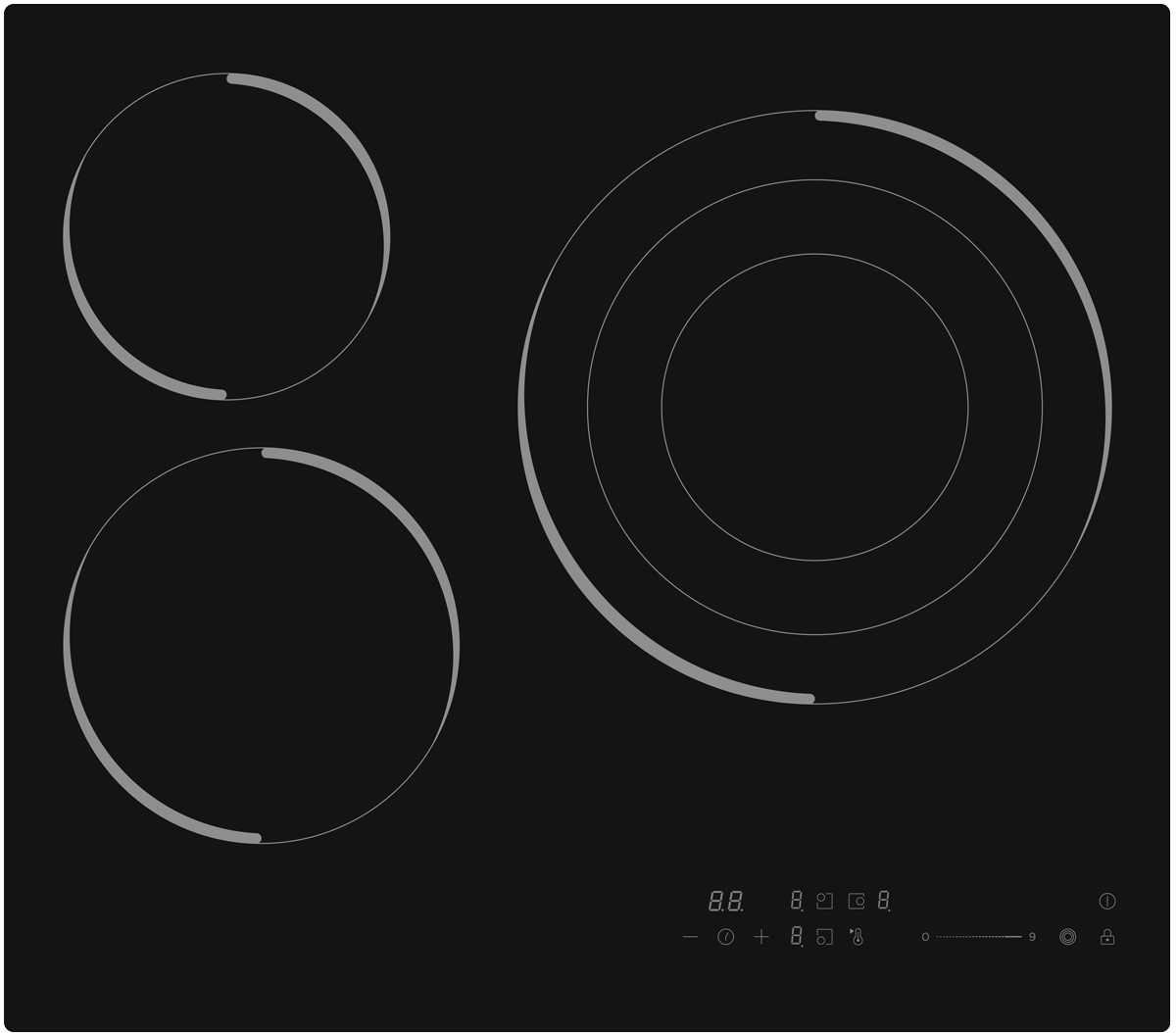 - Сенсорная панель управления: простой и удобный выбор нужной зоны нагрева, мощности и дополнительных функций.